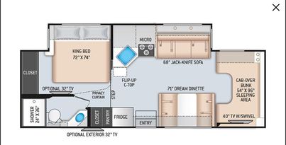 All of your getaways will be something to talk about when you take them in this Chateau Class C gas motorhome! You’ll feel like royalty as you spend your nights sleeping on the RV king bed in the back. Another functional space is the kitchen because it has a flip-up countertop that will fold away when not in use, and the double-door refrigerator will be so helpful for keeping all of your perishables fresh throughout your trip.